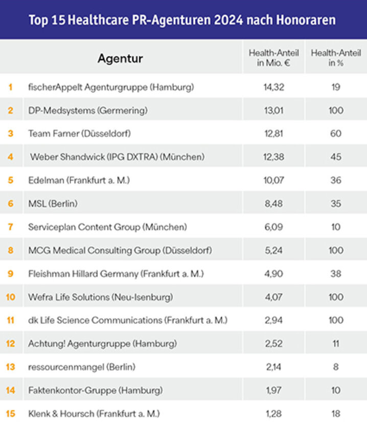 Seit 2019 ist die fischerAppelt Gruppe Marktführer – sie konnte ihren Umsatz laut 2024er Ranking weiter ausbauen. Führend ist fischerAppelt auch im Healthcare-Ranking, neuer Zweiter (und gegenüber 2023 um zwei Plätze verbessert) ist hier die DP-Medsystems AG, die sich 2024 mit der Übernahme der PR-Agentur Petersen & Partner verstärkt hat. Neben dpmed sind drei weitere reine Healthcare-Agenturen vertreten: Die MCG Medical Consulting Group liegt auf Platz 8, Wefra Life Solutions auf Platz 10 (gegenüber 2023 um drei Plätze nach oben geklettert), direkt gefolgt von dk Life Science Communications auf Rang 11, die zwar auch zur Wefra Life Group gehört, ihren Umsatz aber getrennt gemeldet hat.