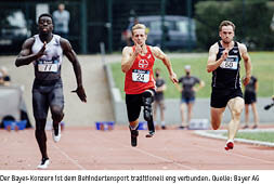 Traditionell eng verbunden ist Bayer auch dem Behindertensport. So verfügt der Verein Bayer 04 Leverkusen über eine eigene Behindertensportabteilung, eine der größten und erfolgreichsten in Deutschland. Hier gibt es nicht nur integrative Trainingsgruppen, sondern insgesamt beste Voraussetzungen zur Ausübung des Leistungs- und Breitensports – Leverkusen ist auch einer der führenden paralympischen Trainingsstützpunkte für Leichtathleten, Sitzvolleyballer und Schwimmer. 90 Medaillen bei den Paralympics sprechen für sich.