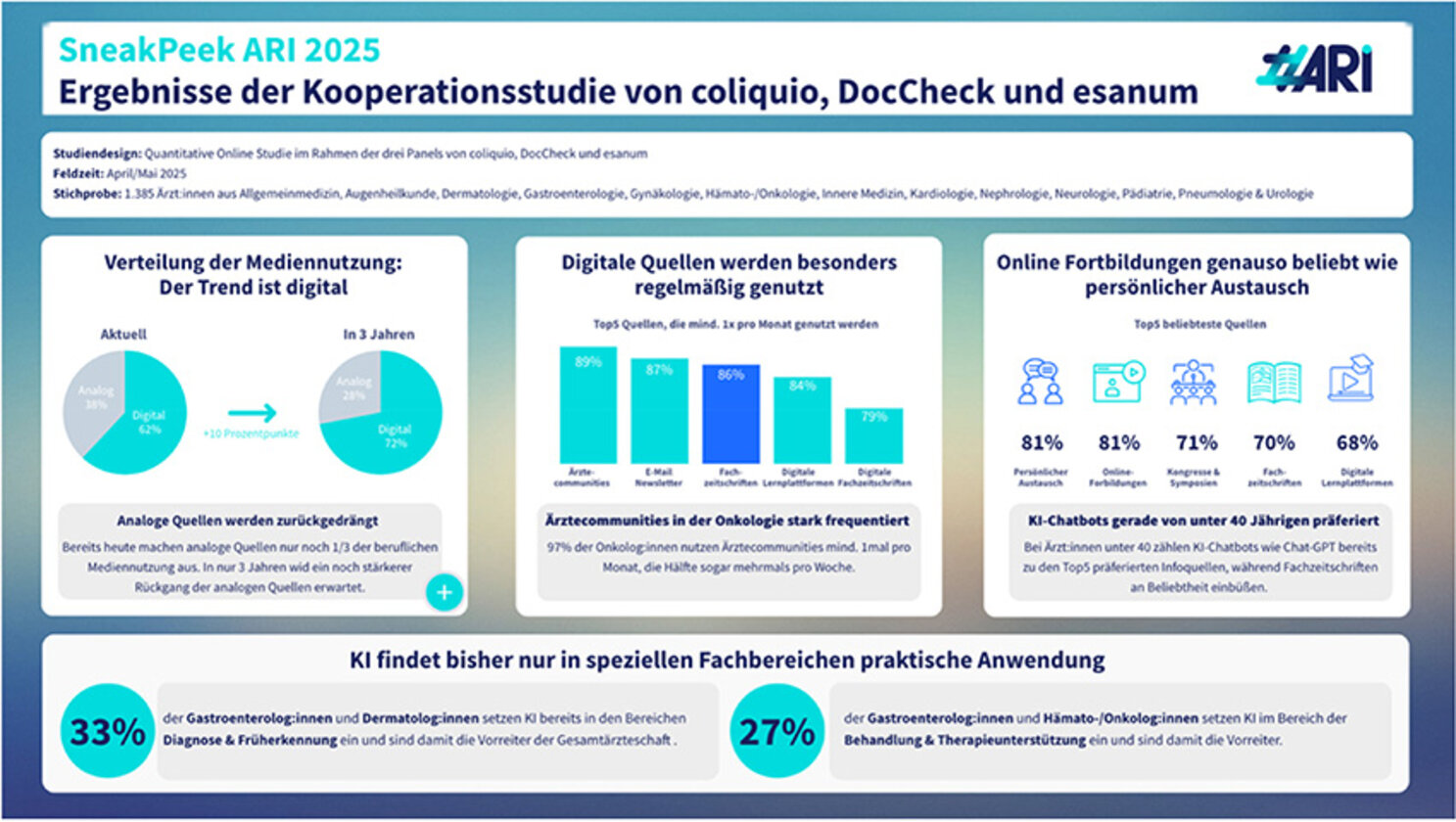 Wie informieren sich Ärztinnen und Ärzte im beruflichen Kontext? Welche Trends lassen sich im Informationsverhalten beobachten? Und welche Rolle nimmt künstliche Intelligenz bereits heute ein? Vor dem Hintergrund dieser Fragen haben die drei größten deutschsprachigen Ärztenetzwerke coliquio, DocCheck und esanum nach der Erstauflage der ARIMediennutzungsstudie im vergangenen Jahr auch in diesem Jahr wieder verschiedene Fachkreise zu ihrer Informationsbescha1ung befragt. Mehr als 1.300 Ärztinnen und Ärzte lieferten hierbei Antworten zu ihrer analogen sowie digitalen beruflichen Mediennutzung und präferierten Informationsquellen.