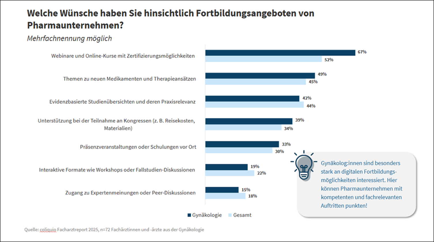Gynäkologinnen und Gynäkologen verlagern Weiterbildung oft in ihre Freizeit und sind am liebsten digital unterwegs. Natürlich sind fachspezifische Themen für sie von Interesse, aber auch Forschung und Entwicklung sowie Digitale Gesundheitsanwendung (DiGA) finden Anklang. Relevant sind Praxisnähe und direkte Anwendbarkeit der Inhalte (56 %). In Bezug auf Kongresse sollte es hybrid sein: Digitale Elemente ermöglichen eine flexible Teilnahme, Elemente in Präsenz fördern das Networking.
